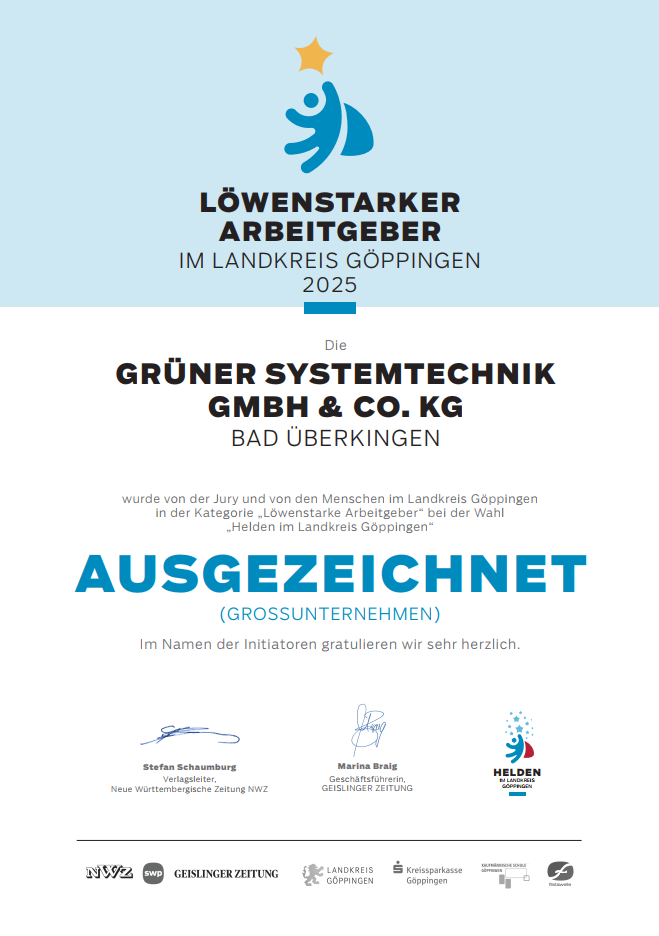 Bei der Heldenwahl im Landkreis Göppingen wurden wir im Bereich der Großunternehmen als löwenstarker Arbeitgeber ausgezeichnet. Am 15. Oktober durften wir im Rahmen der feierlichen Preisverleihung in der Kulturhalle in Süßen die Auszeichnung entgegennehmen. Hierüber freuen wir uns sehr und nehmen dies als Ansporn, auch in Zukunft ein attraktiver Arbeitgeber zu sein.
